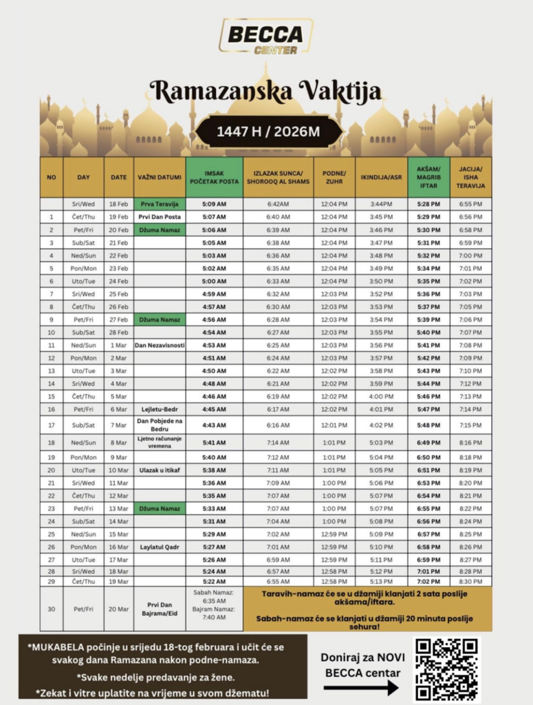 Ramazan je mjesec jačanja vjere u nama i jačanja naše povezanosti u džematu kroz mnoge ibadete. Dobro koje učinimo u ovom mjesecu je bolje i korisnije nego u drugim mjesecima. Ramazanske dane ustrajno postimo od zore pa do zalaska sunca u namjeri da postignemo bogobojaznost, budući da nam Svevišnji Gospodar poručuje: